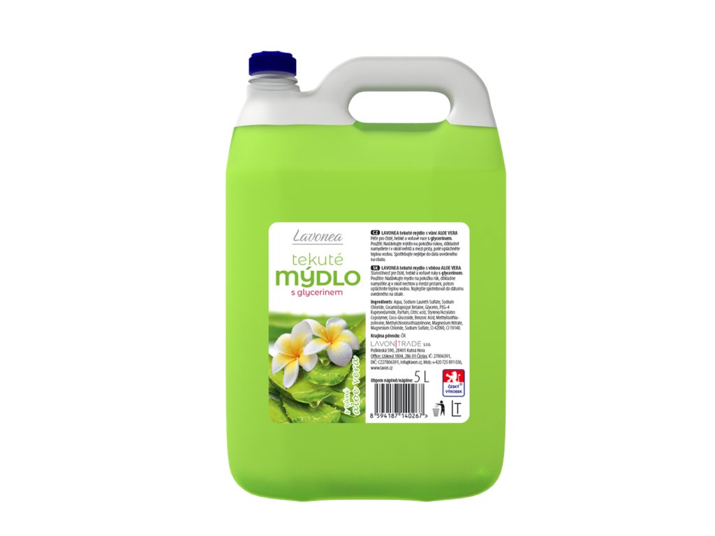 LAVONEA tekuté mýdlo Aloe Vera je kvalitní mýdlo s neutrálním pH a glycerinem pro hebké, čisté a voňavé ruce. Tekuté mýdlo zajistí Vašim rukám a pokožce dokonalé mytí a dokonalou hygienu. Mytí rukou patří k základním hygienickým návykům. Tekuté mýdlo Lavon je vhodné pro každodenní použití. Mýdlo bohatě pění a spolehlivě odstraní z rukou a pokožky špínu a nečistoty. Lavon tekuté mýdlo nedráždí Vaši pokožku a zanechá ji jemnou a hebkou.